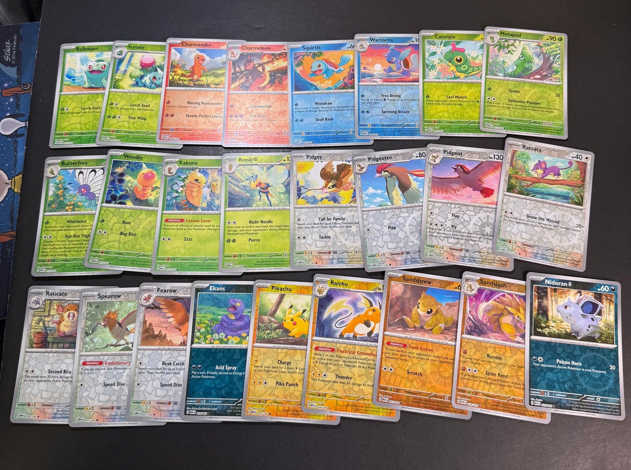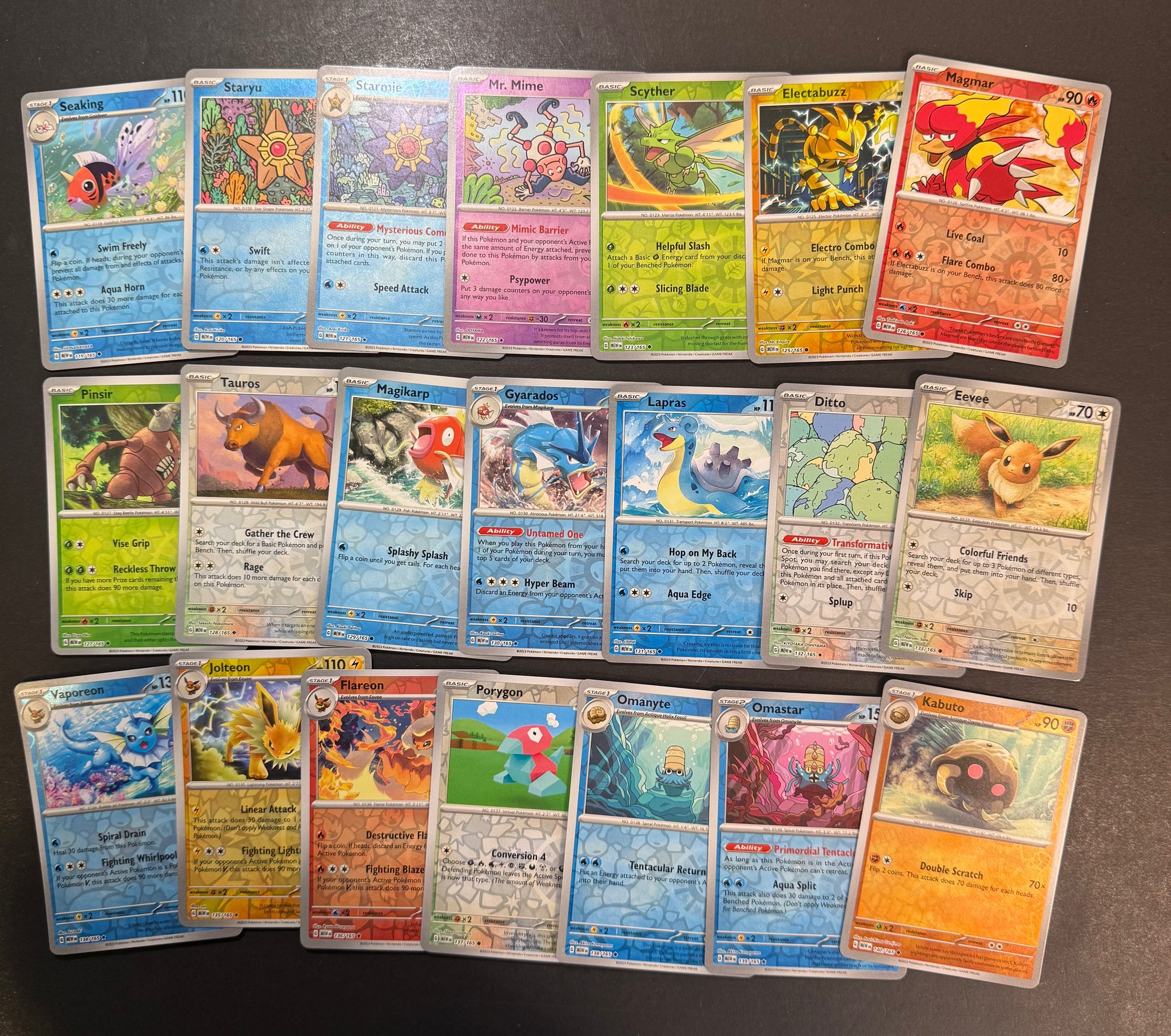 You’ll receive everything from the pictures! There are 164 total cards! Including 3 EX cards, 8 Reverse Holo Energy cards, and 153 Reverse Holo cards! This is a Complete Reverse Holo Set for Pokemon 151! All cards are in brand new condition!